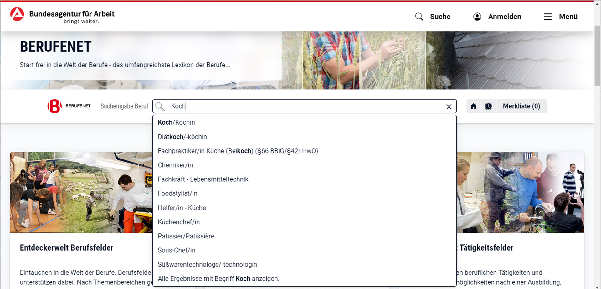 In das Suchfeld können Sie zum Beispiel einen Beruf eingeben.