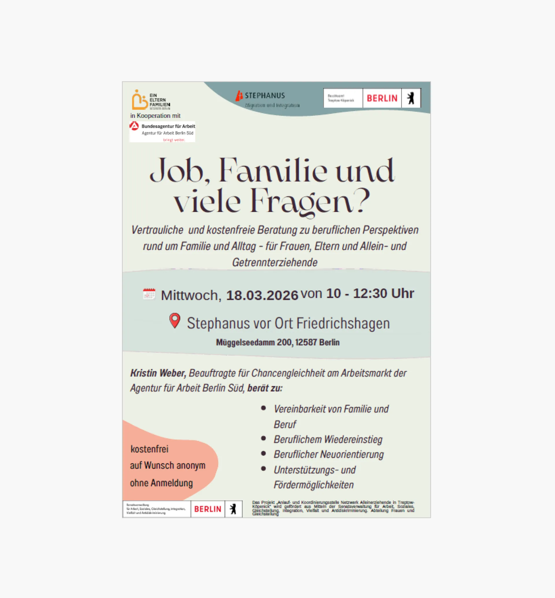 Der Frauenmärz 2026 wird von den Beauftragten für Chancengleichheit am Arbeitsmarkt (BCA) der Berliner Agenturen für Arbeit initiiert und organisiert. Als Ansprechpartnerinnen für Gleichstellung, Vereinbarkeit von Beruf und Familie sowie berufliche Perspektiven laden sie Berliner Frauen herzlich ein, neue Wege zu entdecken, sich zu informieren und miteinander ins Gespräch zu kommen.