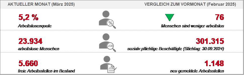 Die Unternehmen suchen weiterhin Mitarbeitende: 1.148 Stellen wurden im März neu gemeldet (113 mehr als im Vormonat und 135 mehr als vor einem Jahr). Die meisten freien Stellen gibt es aktuell in den Branchen sonstige wirtschaftliche Dienstleistungen, Handel Instandhaltung und Reparatur von Kfz, Gesundheits- und Sozialwesen, Verarbeitendes Gewerbe, freiberufliche, wissenschaftliche und technische Dienstleistungen, Baugewerbe. Aktuell befanden sich damit 5.660 freie Stellen im Bestand der Arbeitsagentur.