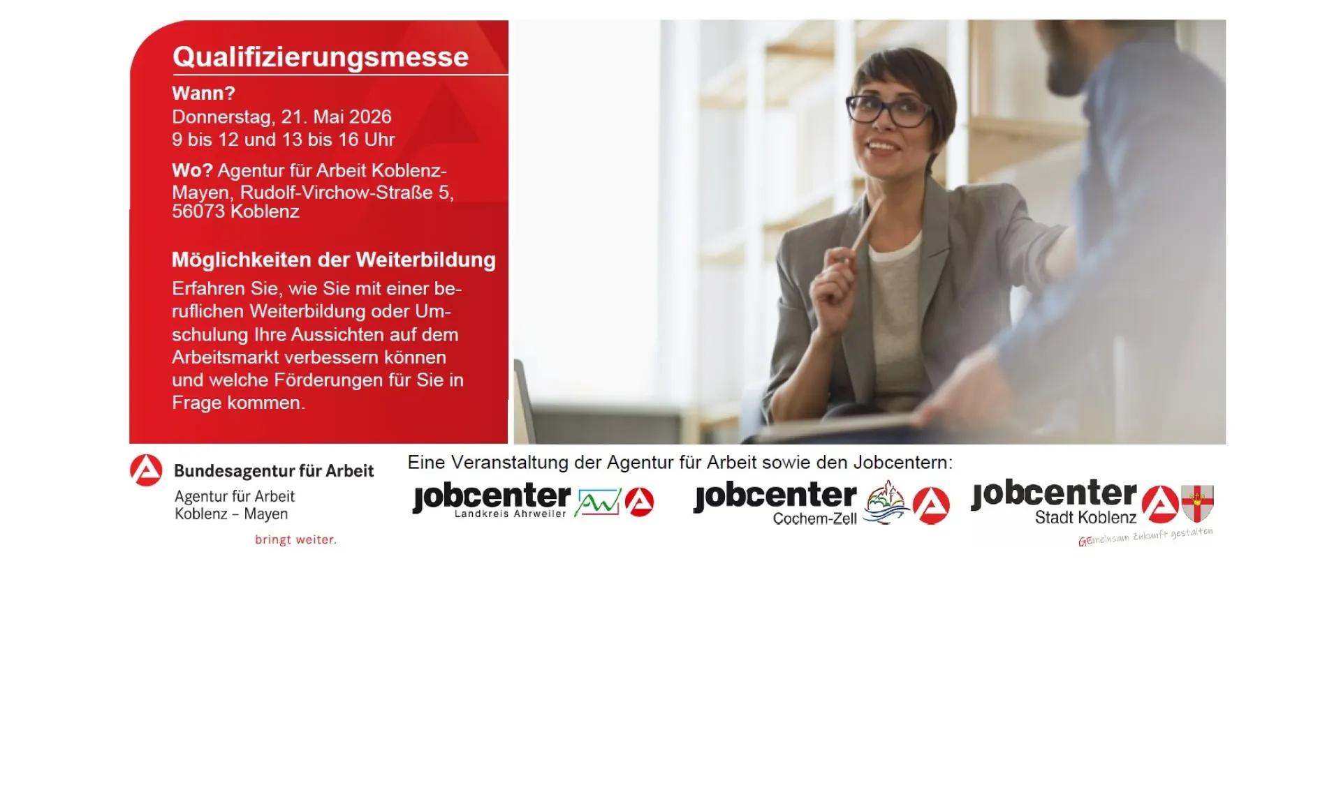 Die Agentur liegt im Verwaltungszentrum des Koblenzer Stadtteil Rauental, direkt beim Klinikum Marienhof. Vor dem blauen Agenturgebäude gibt es einige kostenfreie (zeitbeschränkte) Parkplätze und zwei ausgewiesene Parkplätze für Menschen mit Behinderung. Weitere kostenpflichtige Parkmöglichkeiten gibt es im Parkhaus des Klinikums sowie gegenüber auf dem kleinen Parkplatz beim Finanzamt.