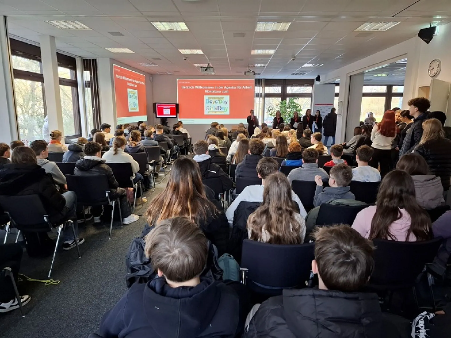 Unter dem Motto "Die Zukunft gehört Dir!" öffneten am 3. April 2025 Unternehmen, Hochschulen und Institutionen bundesweit ihre Türen für den Girls’Day und Boys’Day – so auch die Agentur für Arbeit Montabaur. Knapp 150 Schüler und Schülerinnen der 7. Klassen der Realschulen Nentershausen und Ransbach-Baumbach folgten der Einladung, um die Welt der Arbeit kennenzulernen.