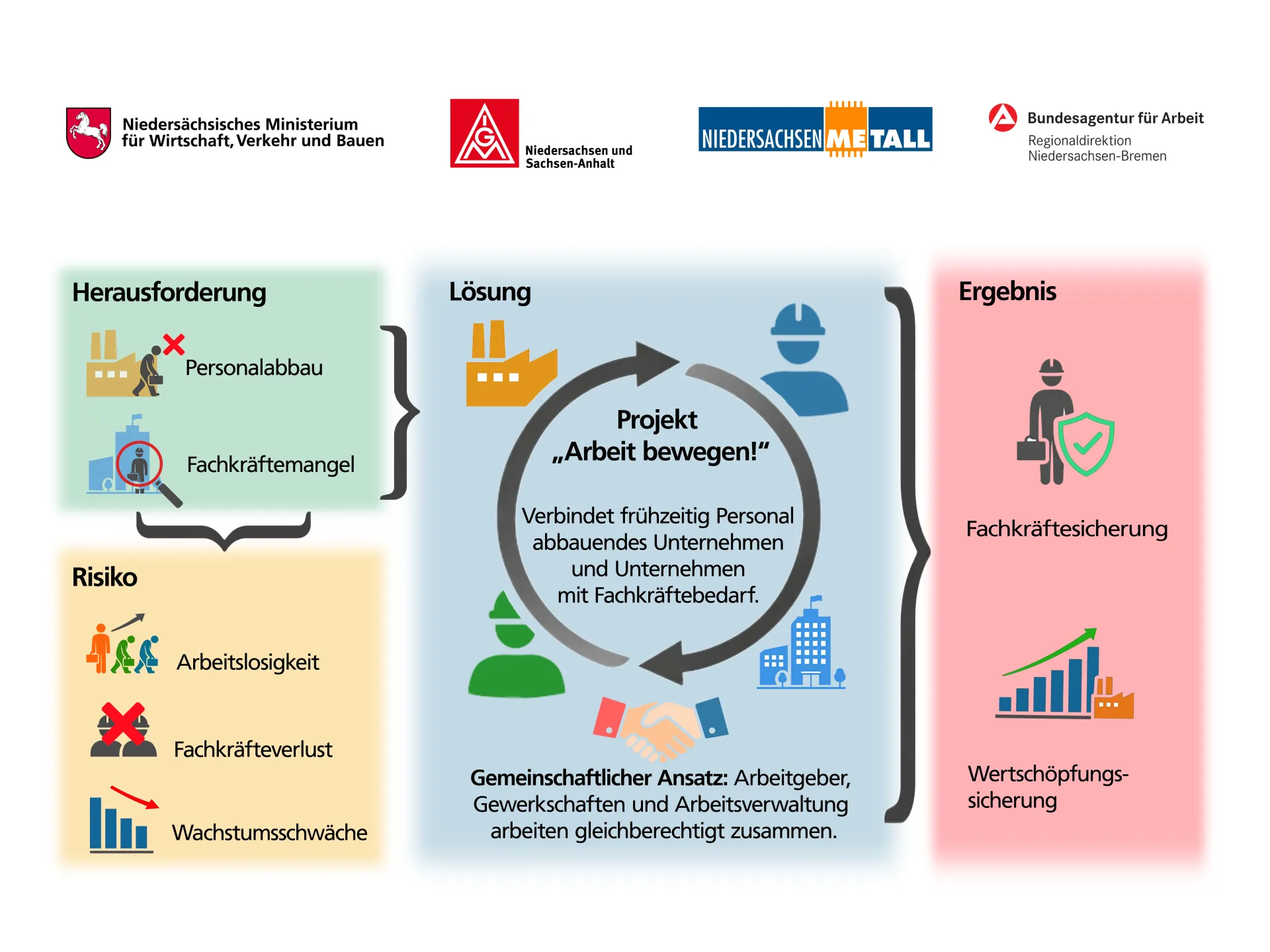 Kern des Projekts ist der frühzeitige, strukturierte Austausch zwischen abgebenden und aufnehmenden Unternehmen, bevor es zu Entlassungen oder Arbeitslosigkeit kommt. Unternehmen, die mittelfristig Personal abbauen müssen, sollen über das Netzwerk frühzeitig identifiziert und mit Betrieben zusammengebracht werden, die Fachkräfte suchen. Beschäftigte erhalten dadurch die Möglichkeit, nahtlos in neue Arbeitsverhältnisse zu wechseln, statt erst arbeitslos zu werden.