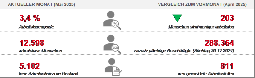 Die Unterbeschäftigung lag nach vorläufigen Angaben im Mai bei 15.852 Personen. Sie sank gegenüber dem Vormonat April (- 295 Personen bzw. - 1,8 Prozent) und erhöhte sich verglichen mit Mai 2024 (1102 Personen bzw. 7,5 Prozent). Zur Unterbeschäftigung zählen neben den Arbeitslosen solche Personen, die nicht als arbeitslos gelten, weil sie beispielsweise im Rahmen von arbeitsmarktpolitischen Maßnahmen gefördert werden.