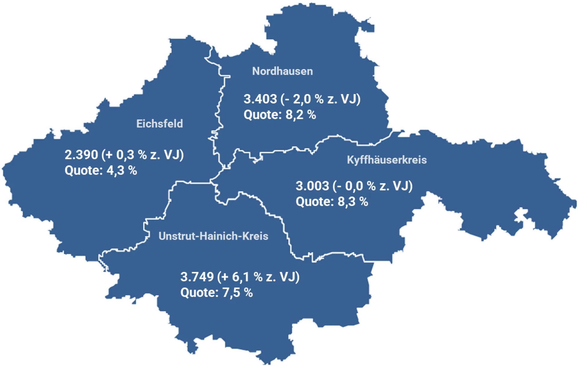 Die Arbeitslosigkeit ist im Landkreis Unstrut-Hainich-Kreis im Mai 2025 gesunken. 3.749 Menschen waren arbeitslos gemeldet, 7 Personen weniger (-0,2 Prozent) als im April, aber 217 Personen bzw. 6,1 Prozent mehr als vor einem Jahr. Damit verzeichnete der Landkreis den höchsten Anstieg der Arbeitslosigkeit zum Vorjahresmonat im Agenturbezirk. Die Arbeitslosenquote betrug 7,5 Prozent und lag damit auf Vormonatsniveau. Vor einem Jahr betrug sie 7,1 Prozent.